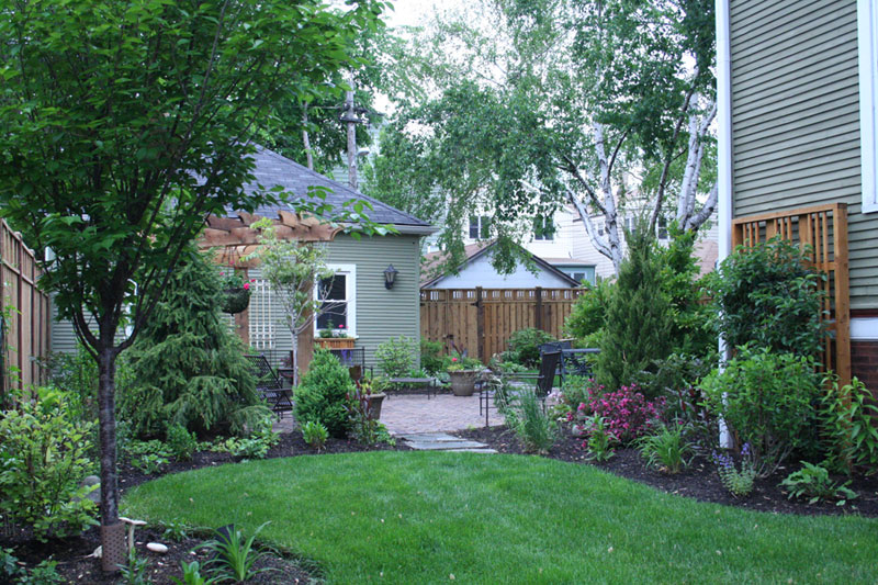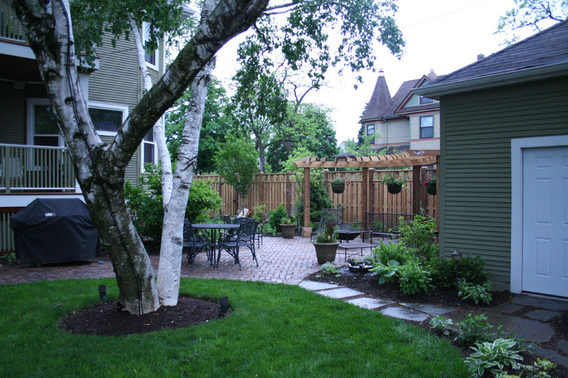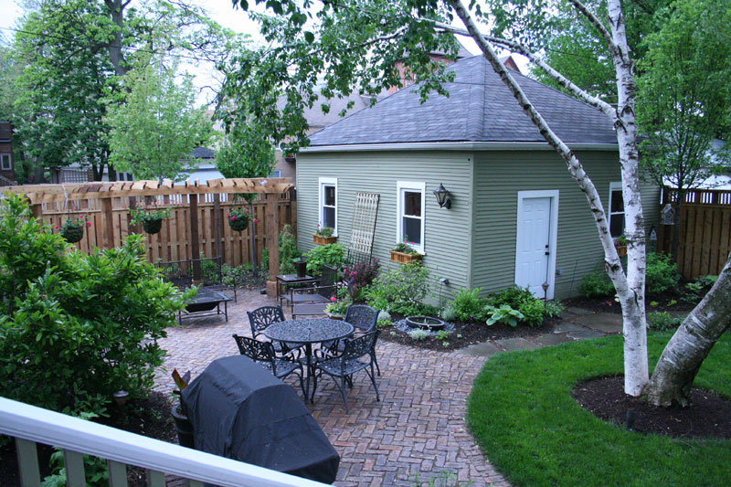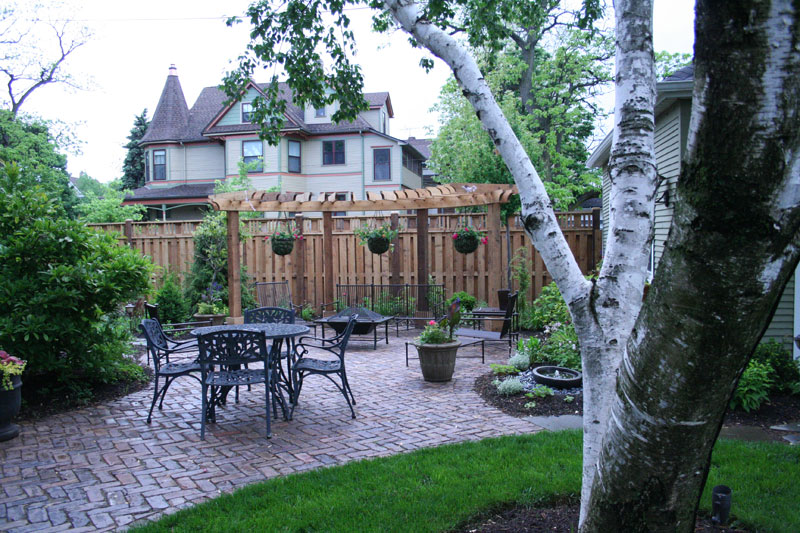 room complete with a curved pergola and reclaimed, antique paver patio. Evergreens